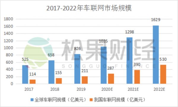 据中国产业信息网数据显示,中国车联网市场规模将从2017年114亿美元增长至2022年530亿美元,2019-2022年占全球份额由26.0%提升到32.5%,年复合增长率为36%,高于全球25.4%的增速。