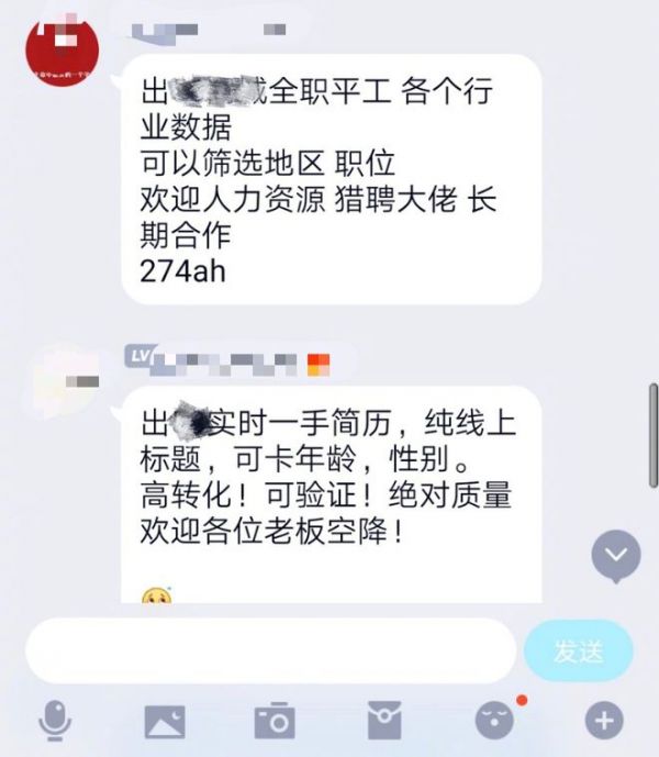 QQ群里不断有人发布出售简历、企业账号等信息。