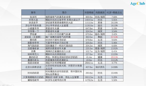 AgeClub不完全统计,仅在抖音走红的中老年网红就超过30位,且不少已成为千万粉丝的头部KOL,例如“我是田姥姥”粉丝量直逼3000万。