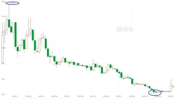 然而,途牛在美股的高光时刻仅仅维持了四个月时间。上市4个月之后,公司股价创出24.99美元的新高,此后就一路下跌。截至2020年4月30日,途牛股价已下跌至0.73美元,濒临退市的边缘。