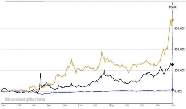 图:截至12月2日,莫德纳股价年内涨幅达到679.75%,拜恩泰科年内涨幅为255.38%,均远超过标普500指数年内14.5%的涨幅。黄线为莫德纳,黑线为拜恩泰科,蓝线为标普500指数