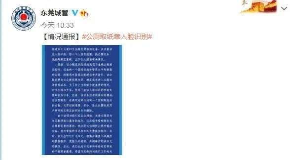 通报称,近期,该分局在工作中发现,有市民反映我街道东江大道03号公厕免费取纸设备,其功能涉及人脸识别,担心个人信息泄露。获悉情况后,该分局高度重视,立即介入跟进有关情况。经核,该公厕是该街道按照东莞市星级公厕建设标准,打造的一个基础设施和管养水平均较高的公厕。根据该市星级公厕建设有关指引,该公厕免费向公众提供纸巾等,相关成本纳入公厕本身管养成本。为了防止出现纸巾被浪费的情况,在供应纸巾方面,使用了类似人脸识别的照相免费取纸巾设备。经查,该设备没有网络功能模块,设计原理是,在规定时间内对同一人限制取纸巾的次数,从而控制浪费。其中,每次拍摄到的用户照片均在规定时间内自行删除。