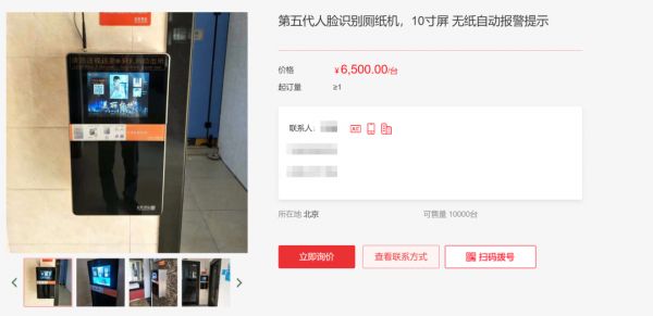据南方都市报,该人脸识别取纸设备的生产企业是天津首联科技有限公司。据该公司官网显示,该公司的第五代人脸识别厕纸机是“为了方便市民用纸及节约企业购纸成本而设计。”