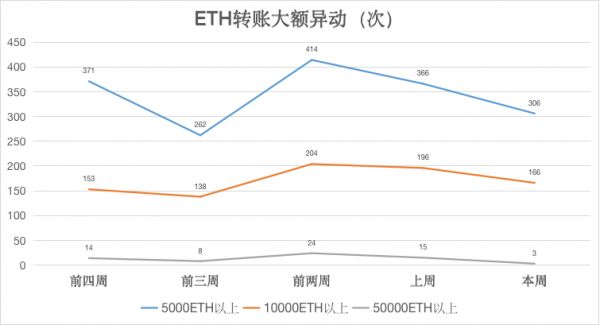 Tokenview数据显示,链上转账次数上周大幅下降,“5 千 ETH 以上”、“1 万 ETH 以上”以及“5 万 ETH 以上”大额转账次数环比下降 16.39%、15.31%、80%,巨鲸账户异动频次降低。