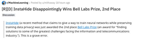 在reddit的一篇贴子上,有人称,「InstaHide令人失望地获得了贝尔实验室奖第二名,这是一个严重的错误。」