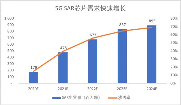 5G SAR(Specific Absorption Rate)用于测量手机辐射对人体的影响。当检测到手机接近人体时适当降低或者调整天线发射功率,从而降低辐射。曦华预计,随着5G手机普及以及标准执行趋严(参见移动电话电磁辐射暴露限值国家标准GB21288-2020),除去苹果用量外, 2020年SAR芯片市场规模近2亿颗,未来数年还将继续增长,尤其中国SAR标准强制执行后,将迎来爆发性增长。每台5G手机需2-3颗SAR芯片,高于4G手机需求量。目前超过80%的市场份额由美国Semtech垄断,同类公司还包括韩国Abov。曦华表示其5G SAR芯片有超高精度电容变化量检测、超远检测距离、宽负载检测范围、温度补偿技术、智能识别及超低功耗等特性,其中灵敏度及检测距离比竞品高60%以上,带载能力比国际龙头竞品高60%以上,抗干扰频段比国际龙头竞品高于60%以上,完全可以实现进口替代。