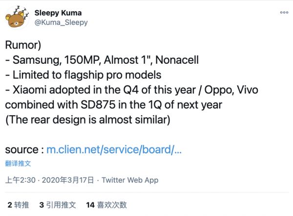 另外,推特用户@Kuma_Sleepy表示,三星已完成1.5亿像素图像传感器的开发。有传言称,小米将于2020年第四季度首发搭载这款150MP图像传感器,OPPO、vivo将于2021年第一季度推出产品。