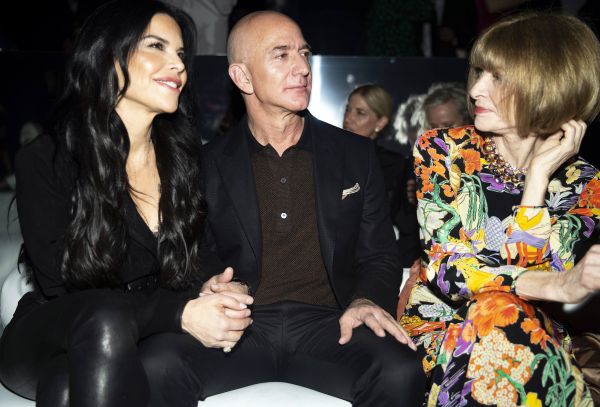2020年2月7日,亚马逊首席执行官杰夫·贝佐斯(Jeff Bezos)、其女友劳伦·桑切斯(Lauren Sanchez),以及时尚编辑安娜·温图尔(Anna Wintour)参加在洛杉矶举行的时装秀。图片来源:Calla Kessler/The New York Times