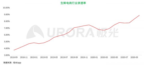 根据极光iapp数据显示,目前生鲜电商行业整体渗透率已超过8%,相比于前两年渗透率已经大幅提升,但是以国民刚需的角度来看,这一水平远未达到投资人和互联网巨头的预期目标。