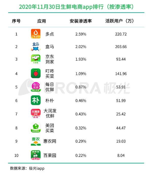 根据极光iapp数据显示,从生鲜电商app渗透率来看,排名前五的主要是以线下社区型为主,包括生鲜O2O型、社区便利店和新零售,当然也包括部分仅有线上运营的前置仓模式的叮咚买菜和朴朴。