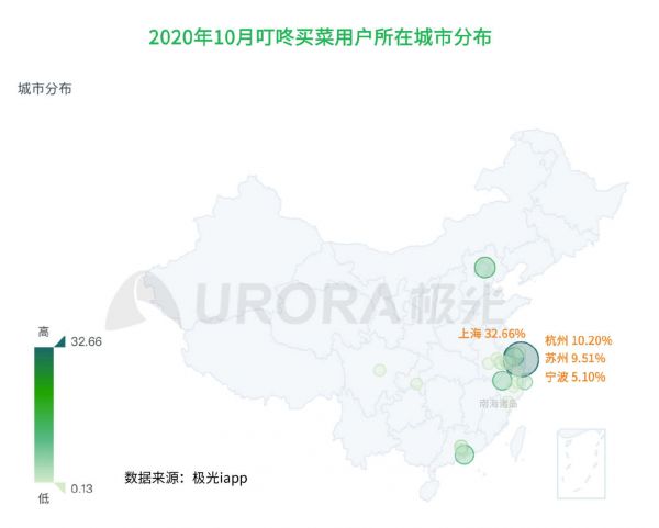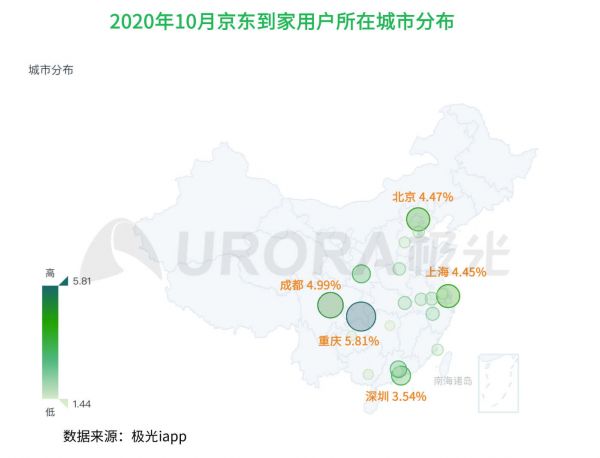 最饱受争议的是前置仓模式,无论在获客还是客户需求导引上,相比于线下门店,前置仓模式都有着天然的弱势,且缺乏线上线下联动,离“新零售”概念跑得有点远,前期资本普遍不看好该模式,但是叮咚买菜和朴朴的出现至少在一定程度上证明了该模式成立的可能性。两者均实现了各自目标的用户价值。朴朴选择在居民小区附近开设前置仓,保证每个前置仓可以覆盖到周边1.5公里的配送范围,开仓策略与7/11便利店开店逻辑相类似,通过在同个区域布局以实现物品集约化配送和管理,且更为重要的是,实现生鲜即时配送时间控制在30min以内,将“即时性”发挥到极致来“破局”,争得生鲜电商一席之地。另一家前置仓模式的叮咚买菜,则通过区域深耕和积累的前端大数据,获得了用户的消费画像和消费需求,精准地备货的同时也精准地对社区居民进行商品推荐。能成功利用此方式的突围者寥寥无几,反映了叮咚买菜内部团队不乏对上海本地生鲜消费习惯有着独到了解。此种方式不仅克服缺乏线下门店所带来的商品展示和引流缺陷,也降低从源头所带来的商品损耗,无线下合作门店也给予生鲜电商平台对商品强把控的可能性,叮咚买菜计划从产地种植,到产地的收获均全程数字化监控,那么未来将能为用户带来品质化商品的价值,但目前叮咚买菜优势区域依然是上海及周边区域(如极光iapp中叮咚买菜用户城市分布图所示),由于不同区域的消费需求差异较大,需求数字模型将无法简单套用,所以这种模式的弊端是扩张速度将远远低于O2O(如极光iapp中京东到家用户城市分布图所示)。