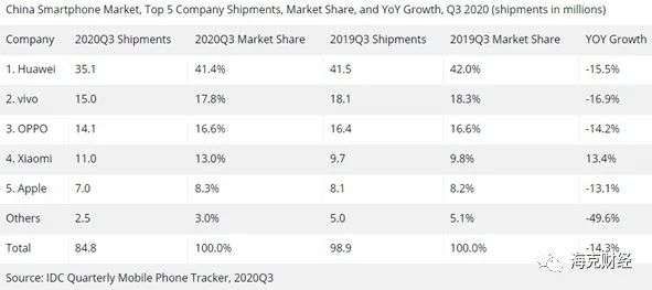 先看全球情况。据市场调研机构IDC的报告,2020年第三季度,全球智能手机出货量为3.536亿部,同比下滑1.3%,尽管好于预期中的同比下滑9%,但形势仍不容乐观,据称到第四季度,随着5G新品的推广,才或将有所回暖。