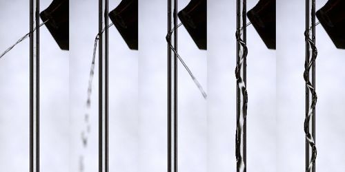 他们发现,毛细水流的运动是否受圆柱体的影响,取决于毛细水流的初始速度,以及毛细水流的粗细。在将直径为0.5毫米的毛细水流,喷射到直径为3毫米的玻璃圆柱上时,当水流速度超过1毫升/秒,圆柱体对毛细水流的直线轨迹几乎没有影响;当流速降低,水流开始慢慢绕圆柱偏斜;当流速降至约0.5毫升/秒时,水流几乎开始完全附着在圆柱体上盘绕。通过对这些螺旋形状以及其形成进行建模,他们首次成功地预测出了这种射流盘绕的阈值流动条件。
