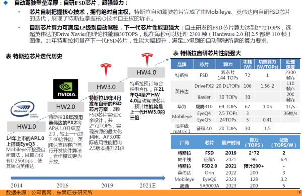 特斯拉的芯片迭代历史可以分为3个阶段:Mobileye、英伟达、特斯拉自研。