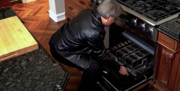 对此,狠人黄仁勋也恶作剧了一回,直接从烤箱里拉出一盘芯片回怼。
