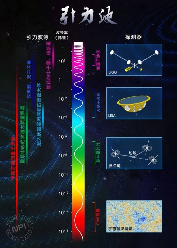 引力波,通常被美称为时空的涟漪。事实上,任何具有质量的物质在加速时都会产生引力波。2015年,激光干涉引力波天文台(LIGO)首次直接探测到了双黑洞并合产生的引力波,从而打开了一扇观测宇宙的新窗口。就像电磁波一样,不同的源也会辐射出不同频率的引力波,而LIGO只能观测引力波谱中的一小部分。令人惊喜的是,当双中子星并合时,不仅会辐射出引力波,也会释放出大量的电磁波,这为探索宇宙打开了更多的可能性,也标志着多信使天文学的崛起。