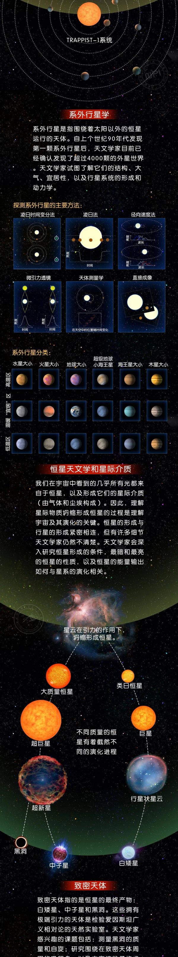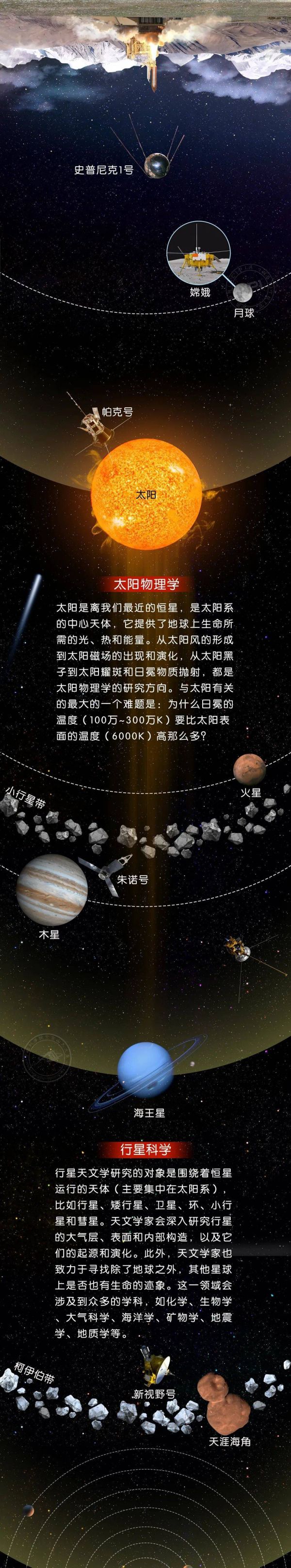 天文学家们有着不同的兴趣领域,有的专注于研究太阳,有的热衷于寻找地外生命,有的致力于破译高能宇宙射线的起源。我们对宇宙的认识离不开地面观测设备的不断发展,以及一系列太空望远镜、航天器的成功发射。接下来,让我们从地表出发,一同认识天文学的主要研究领域:
