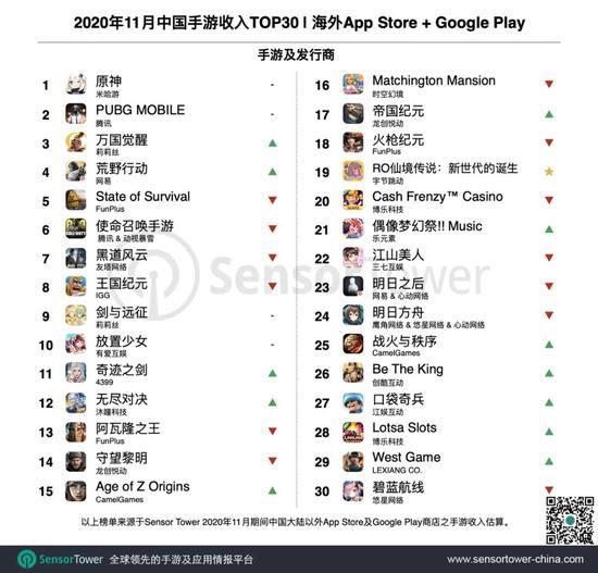 2020年11月成功出海的中国手游TOP30:《原神》蝉联收入冠军