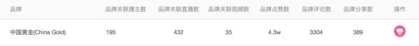 飞瓜数据专业版显示,在中国黄金(China Gold)这一品牌下方,关联直播次数达到了432场,且关联主播数量达到了195人。