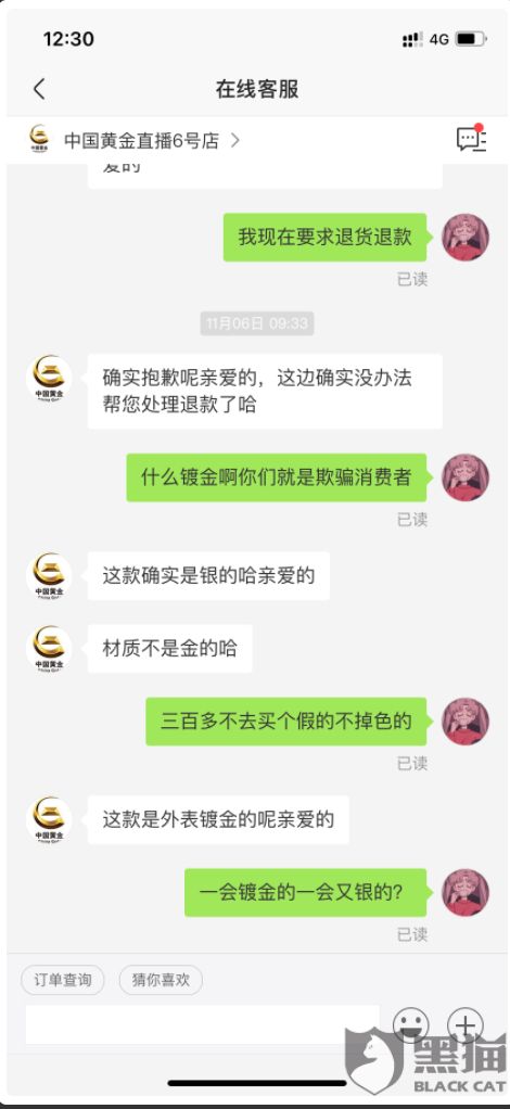 有用户表示,在抖音主播朱瓜瓜直播间购买了中国黄金专场饰品。在签收后,一直放在盒子里没有碰过。时隔一个月之后却发现,链子发黑严重,根本无法佩戴。该用户联系到了抖音客服和中国黄金官方客服,却被告知是因为他没保养好氧化的链子,而且不能退货,只能更换。