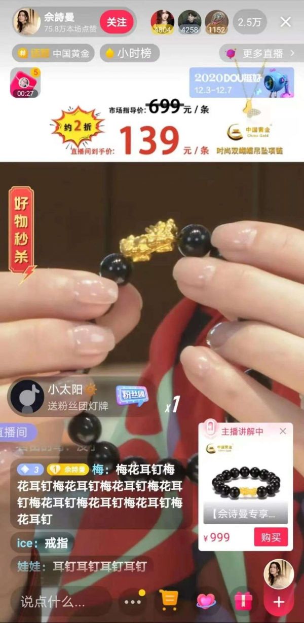 以12月5日的佘诗曼抖音中国黄金直播带货专场为例,一款中国黄金足金貔貅玉髓原价为999元,而在抖音小店里被降到了699元,紧接着在直播间内,该款手链的价格被降到了199元的低价。实在诱惑。