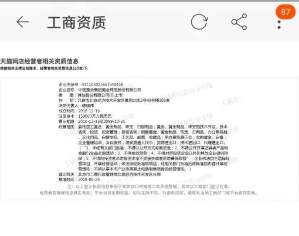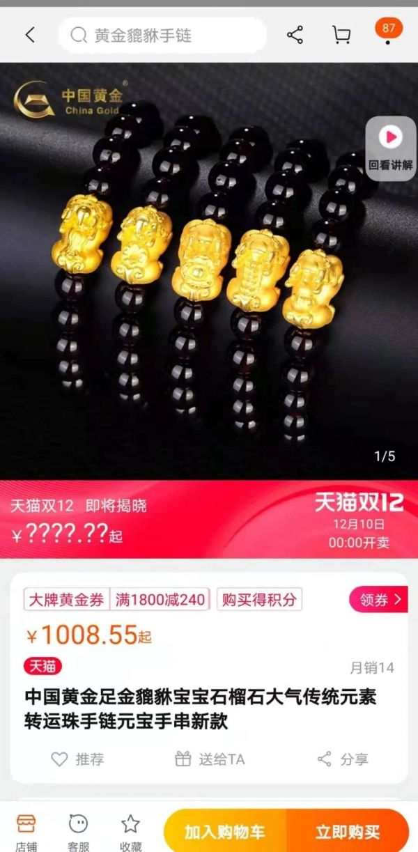 另外,新腕儿观察到,在淘宝中国黄金官方旗舰店,并没有中国黄金足金貔貅玉髓的品类,取而代之的是一款足金貔貅宝宝石榴石的手串,售价根据黄金重量略有差别,区间为1008元-1049元。这与新腕儿在线下实体店所了解到的价格非常相近。而据新腕儿观察,该店铺的资质确实为中国黄金集团黄金珠宝股份有限公司。