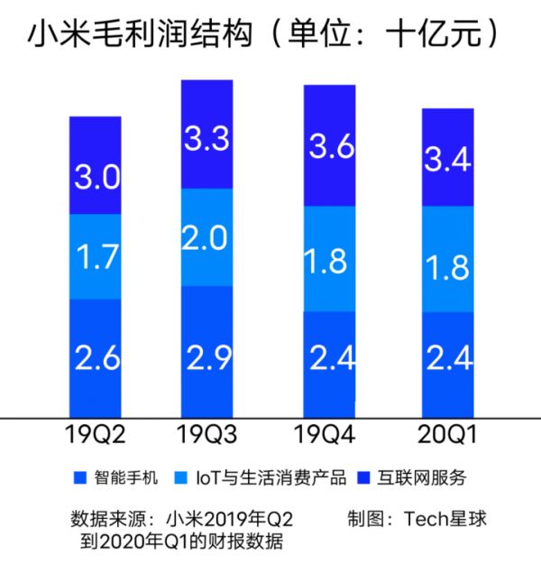 众所周知,小米三大主营业务分别为智能手机、loT与互联网服务。其中,小米硬件承诺利润率不超过5%,IOT营收的还没发展到时机,而互联网服务仅用不到10%的营收,撬动了其超30%的毛利,“铁人三项”中最瘸腿的互联网业务成为小米的净利润主力。
