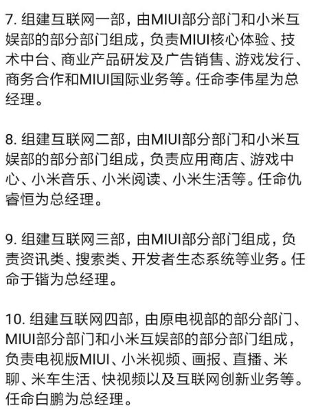 同年的9月13日,雷军发出内部邮件宣布了小米集团最新的组织架构调整和人事任命。王川成为了小米的集团参谋长,负责各个业务部门的战略执行。另外,原有的MIUI部、小米互娱、生态链部和电视部进行重组,成立10个新的部门,包含有4个互联网部门、4个硬件部门,并在2019年又相继成立互联网第5部门和互联网商业化部门,分别负责海外的互联网业务和广告业务变现,其中小米互联网创新业务由互联网第四部门的白鹏负责。至此,小米的互联网业务部门多达6个。