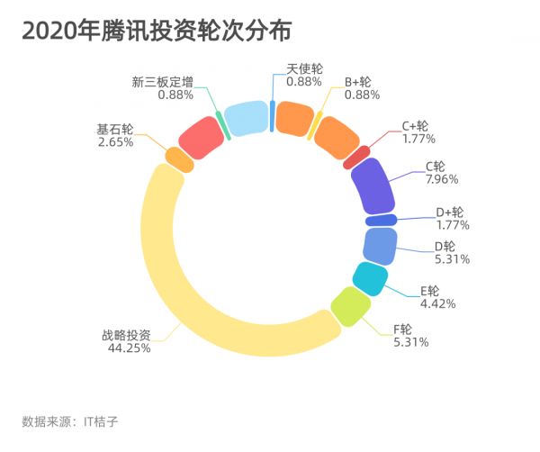 从投资轮次分布来看,作为一家集团公司,腾讯通过对外投资进行战略布局是理所应当的「正业」,2020 年其所有投资出手中有战略投资意义的交易占比接近 45%,其战略投资的公司多在 To B 方向、游戏、文娱传媒领域;另外,腾讯的 2020 年从天使轮到 E 轮、F 轮到公司 IPO 前的基石轮,再到对上市公司的增持,甚至连新三板定增都没有落下,可谓对全阶段公司股权资产的通吃。