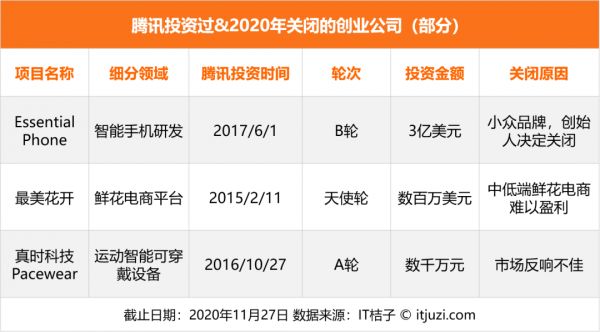 根据 IT 桔子记录,腾讯曾投资过、在 2020 年关闭的项目包括美国的智能手机研发公司 Essential、国内的鲜花电商最美花开,以及运动智能可穿戴设备真时科技等。