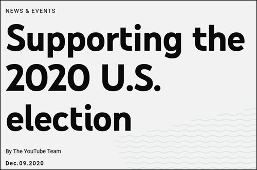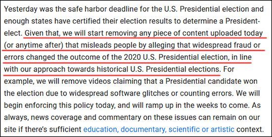 但12月8日,美国的计票结果认证工作正式结束,所有州及地区均已完成认证工作,因此YouTube将相应地改变管理政策。
