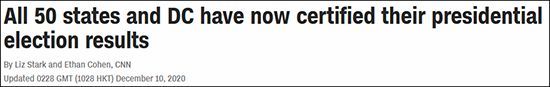 “美国全部50个州及华盛顿特区完成选举结果认证工作”,CNN报道截图