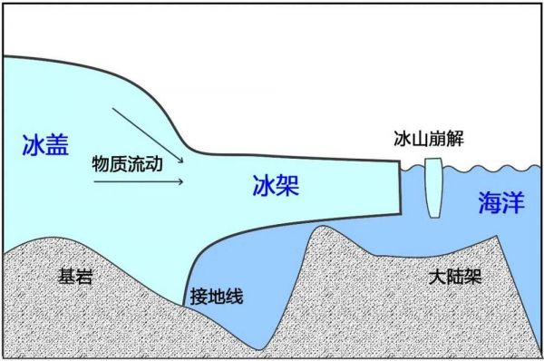 冰架示意图。冰架是陆地冰体在重力驱动下的产物,由冰体不断从接地线向海洋方向流动形成。冰架崩解会形成冰山。冰架是冰盖与海洋相互作用的主要界面,其稳定性很大程度决定了冰盖的稳定性。|编辑制图