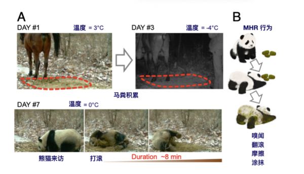 图2. A为自然保护区内的马粪积累;B 为大熊猫的 HMR 行为图示;C 为野外拍摄的大熊猫 HMR 行为,持续时间约为 8 分钟。