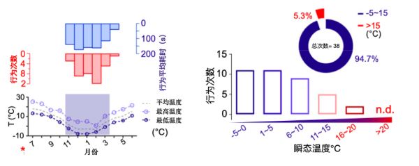 图3. 左图显示了 HMR 行为次数、耗时与月份之间的关系,右图为 HMR 行为与环境温度之间的关系