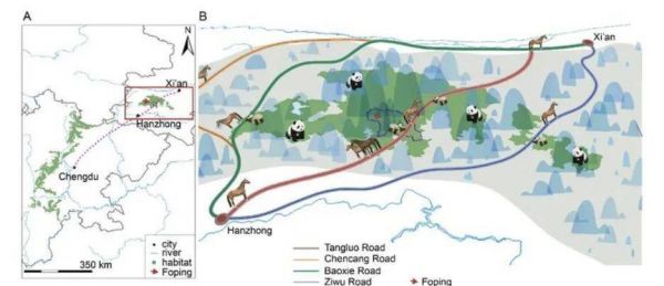 图5. 古代的通商路线(A)与熊猫们可能出现的地方(B)。