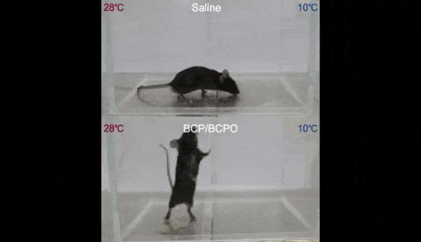 由于实验对象(大熊猫)数量有限,为了验证这个假设,研究团队选择了小鼠作为替代。他们发现,相比于涂抹盐水的小鼠,涂抹了 BCP/BCPO 的小鼠更愿意呆在低温环境中,并且在寒冷气温(4 °C)下还表现出了更少的“抱团(huddling)” 等应对寒冷的行为表现。