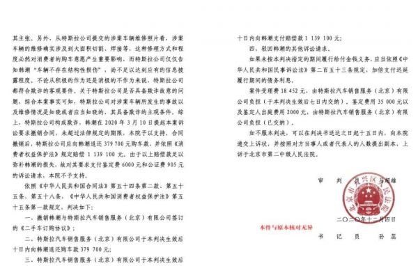 韩潮向《每日经济新闻》记者提供的一审判决结果显示,特斯拉公司由于向其交付官方认证二手车Model S确实涉及大面积切割、焊接等,这种修理方式和程度必然对消费者的购车意愿产生重要影响,而特斯拉公司仅告知韩潮“车辆不存在结构性损伤”,尚不足以达到应有的信息披露程度。北京市大兴区人民法院一审判决特斯拉公司构成欺诈,裁定特斯拉向车主退还37.97万元购车款,并依照《消费者权益保护法》规定赔偿113.91万元。