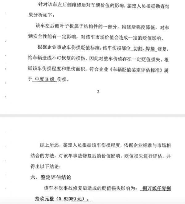 晶实鉴定提供的另一份车辆贬值损失鉴定结论书显示,该车左后侧叶子板、后围板有明显修复痕迹。晶实鉴定明确,该车左后侧叶子板属于结构件的一部分,维修后强度降低,对车辆安全性能有一定影响,会对车辆市场价值造成一定贬值影响。根据车辆伤损程度和损伤面积,符合企业《车辆贬值鉴定评估标准》里的中度B级损伤。为此,晶实鉴定给出该车本次事故修复后,造成的贬值损失约为82089元。