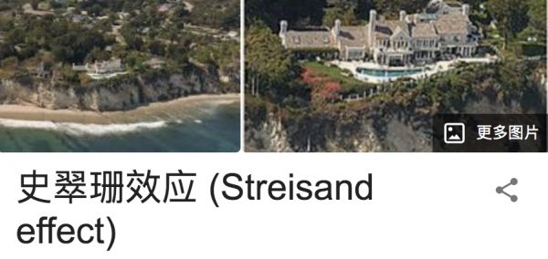 *注:2003年,美国歌手、演员芭芭拉·史翠珊(Barbra Streisand)状告摄影师肯尼斯·阿德尔曼和网站Pictopia.com,令其移除阿德尔曼所拍摄的12000张加州海岸摄影中包含的对史翠珊住所的航拍,以保护史翠珊的隐私。结果,史翠珊败诉,次月有多达420000人前来浏览该网站。