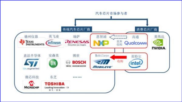 过去,车载芯片被恩智浦、英飞凌、德州仪器等传统汽车芯片巨头把控。但随着汽车智能化程度不断提高,涉及到与用户交互越来越多,因此之前在消费领域的芯片巨头比如高通、英特尔、英伟达也纷纷切入汽车芯片市场。
