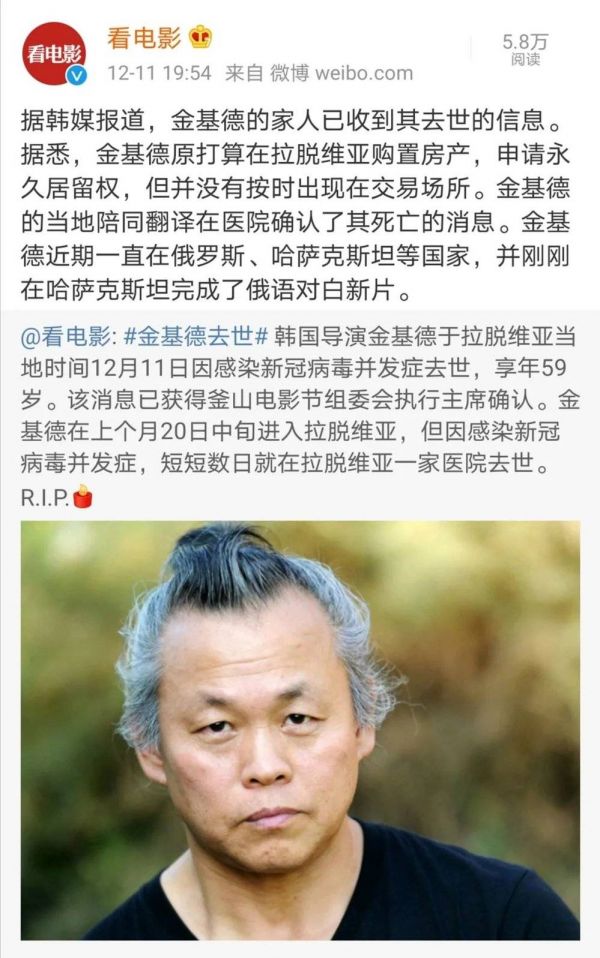 12月11日,之前饱受争议的韩国著名导演金基德去世,享年59岁。