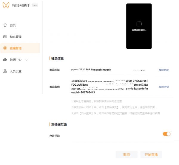 此外,近期关于视频直播推流功能的消息也很多,此前微信给部分企业和媒体开通了推流功能。微信开放社区内的官方回复是视频号推流能力目前在内测中,根据一些用户流传出来的图片看,可以通过beta版的视频号助手(PC网页版视频号助手)在电脑上推流,支持OBS推流。
