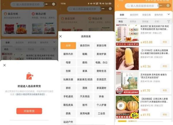 目前,视频号直播商品还是统一走微信小商店的渠道,支持京东、拼多多、有赞商品的链接导入;此外,还支持在“选品库带货”小程序中直接挑选带货商品,其中的商品也是来自京东、拼多多等,主播可以根据品类、佣金、销量等指标筛选。