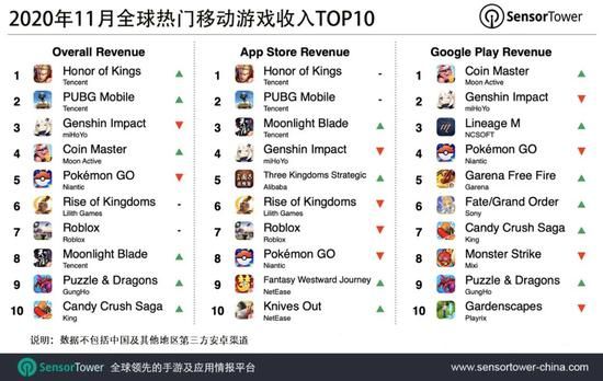 新浪科技讯 12月14日上午消息,Sensor Tower 商店情报数据显示,2020年11月腾讯《王者荣耀》在全球App Store和Google Play吸金2.3亿美元,较2019年11月增长62.5%,位列全球手游畅销榜榜首。来自中国App Store的收入占96.4%,台湾版本贡献了1.4%,泰国版本贡献了1%。全球热门移动游戏收入Top10完整榜单请见上文图表。说明:数据不包括中国及其他地区第三方安卓市场。