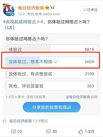 不过,对于很多网友来说,他们并不相信占卜这一套,也不会去体验。每日经济新闻12月9日发起的有关“你体验过网络占卜吗”投票显示,在1.7万人中有6604人表示,“没有体验过,根本不相信。”