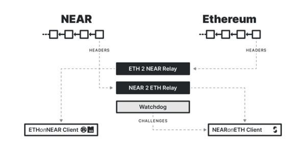 彩虹桥的技术原理是,两个无需大量运算就能追踪链上状态的轻型客户端在配合工作:一个是用 Rust 语言执行的以太坊轻型客户端(作为一个 NEAR 合约),另一个是用 Solidity 语言执行的 NEAR 轻型客户端(作为一个以太坊合约)。同时,两者在以无需信任的方式验证其追踪的状态,在确认最终性后,将数据通过中继层转移给对方生态使用。(Odaily星球日报注:对细节感兴趣的开发者,欢迎来 Github 查看文档。)