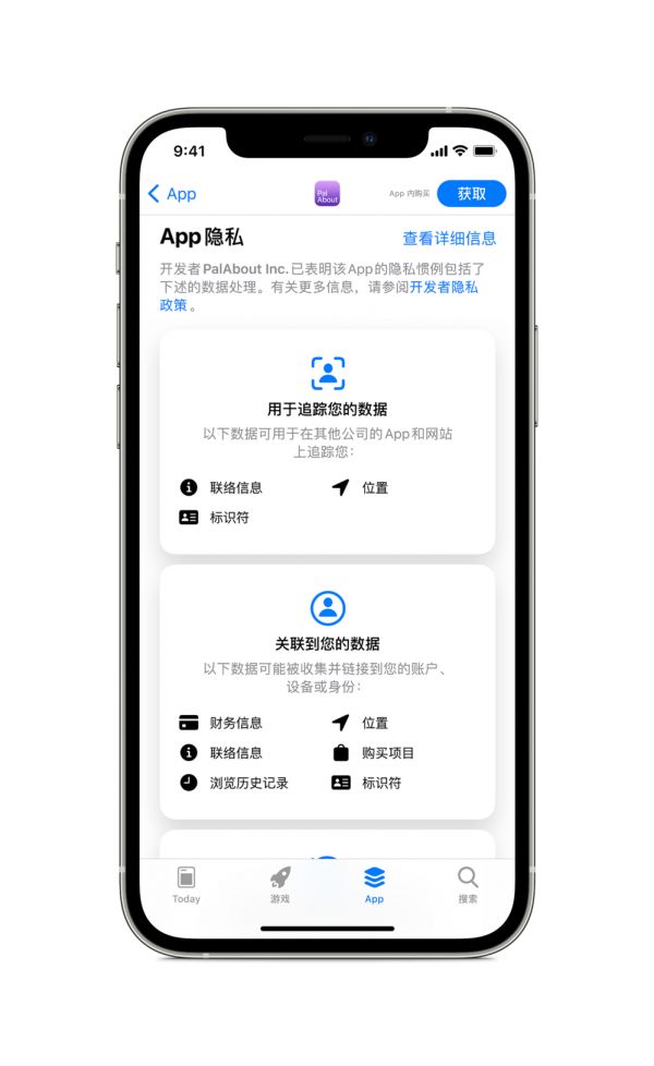 而从用户的角度看,在 app 开发者更新页面后,App 产品页面将呈现 app 可能会收集的数据类型,以及该 app 是否会使用该数据来追踪你,或该数据是否会关联到你。