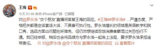 王海在微博中表示,罗永浩擅长的领域是英语教学和脱口秀,选品方面出现问题是在所难免的,所以他已经举报,并且要将罗永浩以及品牌方告上法庭。