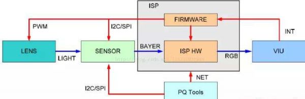 根据专业人士的介绍,ISP的具体处理流程是这样:Lens 将光信号投射到sensor 的感光区域后,sensor经过光电转换,将Bayer 格式的原始图像送给ISP,ISP经过算法处理,输出RGB空间域的图像给后端的视频采集单元。在这一过程中,ISP通过运行在其上的Firmware固件对ISP逻辑,从而对Lens 和sensor进行相应控制,进而完成自动光圈、自动曝光、自动白平衡等功能。其中,Firmware的运转靠视频采集单元的中断驱动。PQ Tools工具通过网口或者串口完成对ISP 的在线图像质量调节。